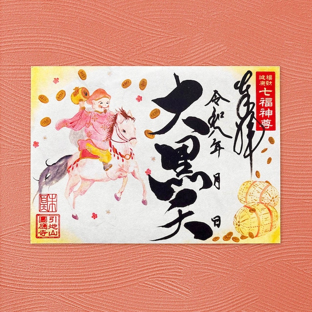 開運画家 朱凰さんとの七福神コラボ御朱印 第2弾は大黒天さま 令和8年は、丙午年。 午年ということで、七福神シリーズ第二弾は、馬に乗った大黒天様を描きました。 大黒天様は、七福神の中でも「福徳円満」「商売繁盛」「五穀豊穣」など、生活を豊かにする強い力を持つ神様です。 また、馬は神聖な動物であり、神仏のお使いの役割があります。 神仏を信仰する人々の元に、神様や仏様を連れて行き、願いを叶える手助けをします。 新春からはじまる頒布期間の間、 こちらの御朱印を拝受された方へ、大黒天様が大福徳を運びますように、護摩の秘法を修して、心からご祈念させて頂きます。 大黒天様のようなふっくら丸々とした文字は、おなじみ奏鳳先生です。 約A5サイズとなります。